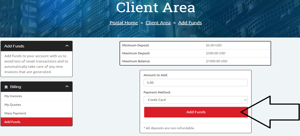This will open the Add Funds area. Enter the amount you wish to add. Choose payment method. Click on the red Add Funds button.