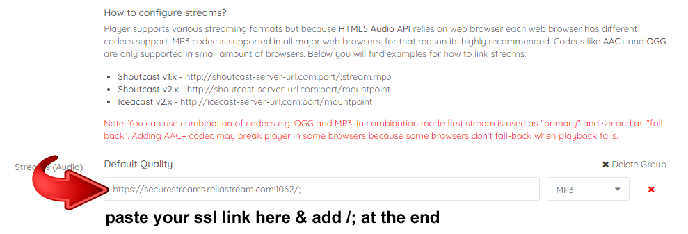 The responsive radio player has the ability to play your SSL Secure link but you will have to add something at the end of your SSL link to get this working on the responsive radio player. Once you are logged into your responsive radio players admin panel click on the channels option. Here you can either add a new station or edit your current station. Copy your SSL Secure Link from your Media Control panel and paste your link in the Streams (Audio) box. Now you want to add /; at the end of your SSL Secure Link and press the green SAVE button at the bottom of the responsive radio players admin page to save your link.