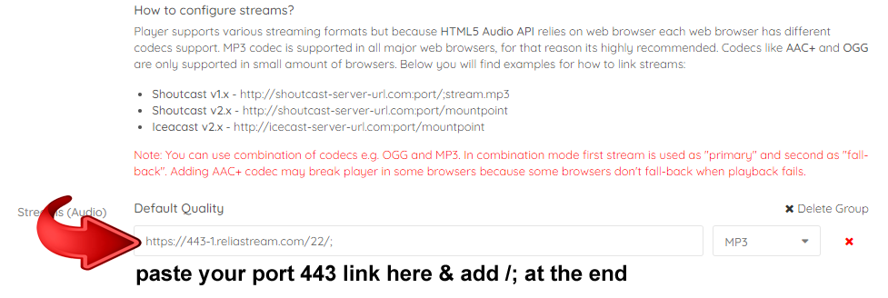 The responsive radio player has the ability to play your Port 443 Secure link but you will have to add something at the end of your Port 443 link to get this working on the responsive radio player. Once you are logged into your responsive radio players admin panel click on the channels option. Here you can either add a new station or edit your current station. Copy your Port 443 Secure Link from your Media Control panel and paste your link in the Streams (Audio) box. Now you want to add /; at the end of your Port 443 Secure Link and press the green SAVE button at the bottom of the responsive radio players admin page to save your link.